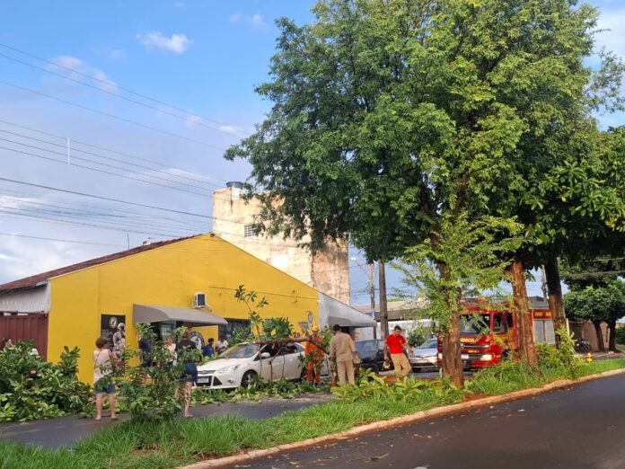 Uma árvore caiu sobre um carro na Avenida Florestal, no bairro Coophatrabalho, durante o temporal que atingiu a cidade nesta quarta-feira (25).