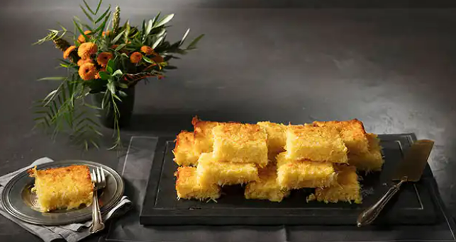O diferencial está na combinação de ingredientes simples, mas potentes: mandioca, queijo, coco e açúcar. O resultado é um bolo levemente crocante por fora, macio por dentro e com sabor intenso, que mistura o doce com o salgado de forma equilibrada.