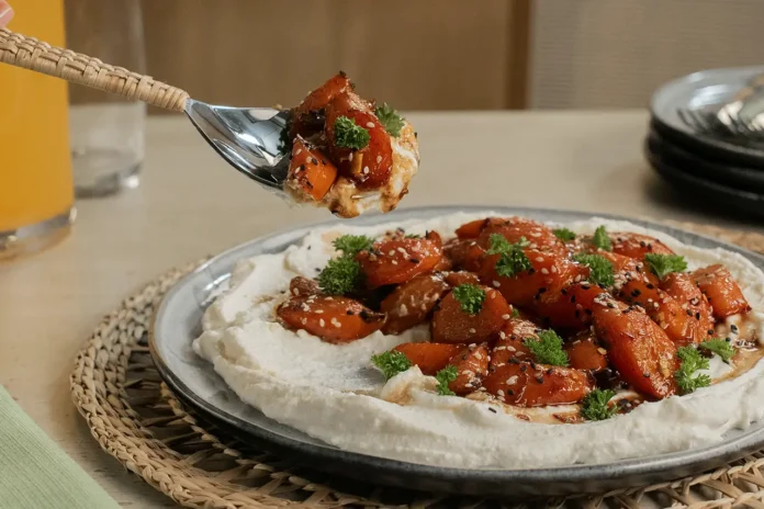 Para servir, espalhe o creme de ricota em um prato ou travessa, acomode as cenouras por cima e regue com o restante de mel picante.
