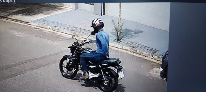 Imagens de um sistema de segurança obtidas pela vítima mostram o momento em que o suspeito comete o furto e depois foge com a motocicleta.