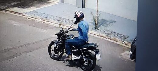Em um dos vídeos, o homem aparece virando uma esquina já conduzindo a moto, enquanto um comparsa o acompanha logo atrás, indicando possível participação no furto.
