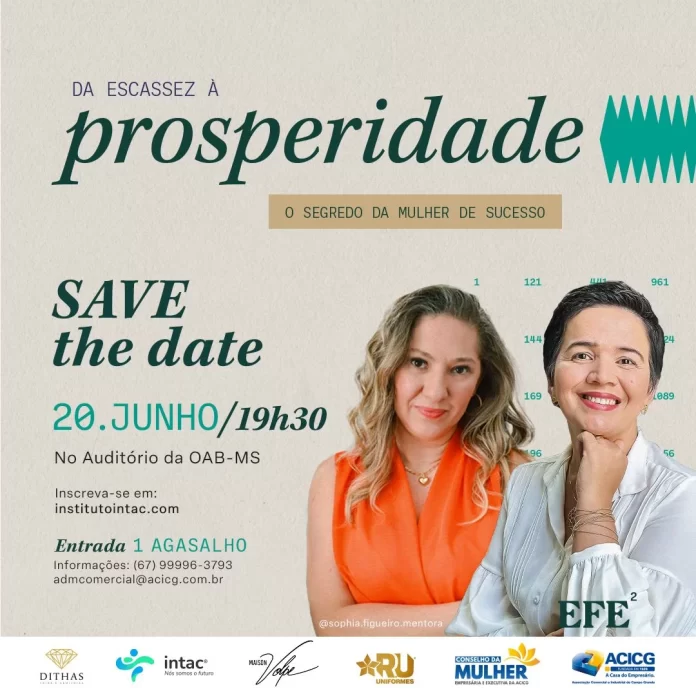 As inscrições para o evento “Da escassez à prosperidade – o segredo da mulher de sucesso” podem ser feitas pelo link ou pelo telefone (67) 99996-3793. A palestra também conta com o apoio da Comissão da Mulher da OAB-MS e Senac Hub Academy.