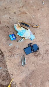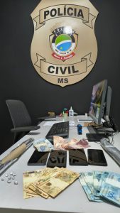 Diante dos fatos, uma equipe de policiais civis deslocou a residência, realizando procedimento de revista pessoal nos presentes. Foram encontrados na posse dos conduzidos 8 pedras de crack, grande quantia de dinheiro em notas indiciando a mercancia de entorpecente, bem como apetrechos para embalagem e vários celulares sem procedência lícita.